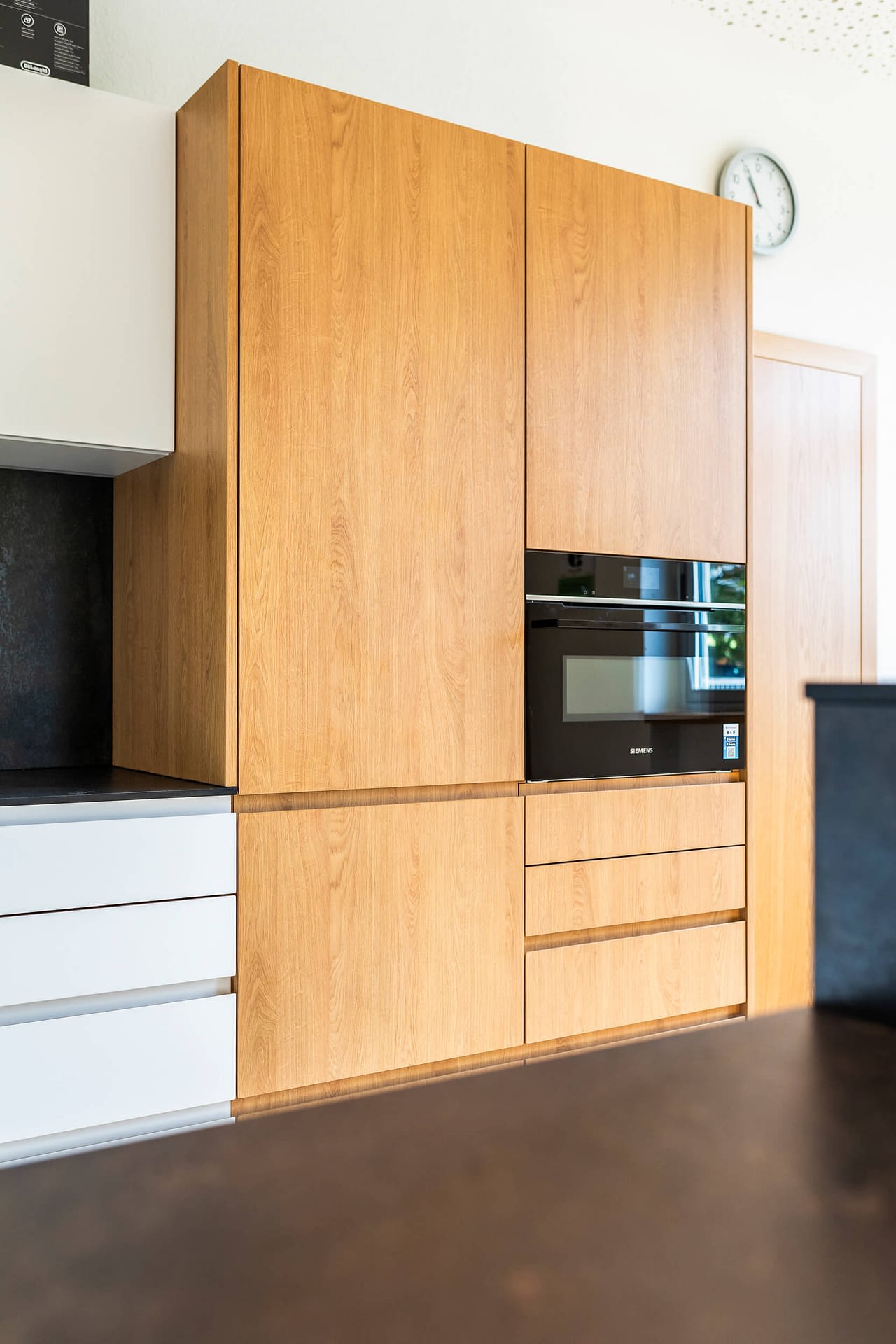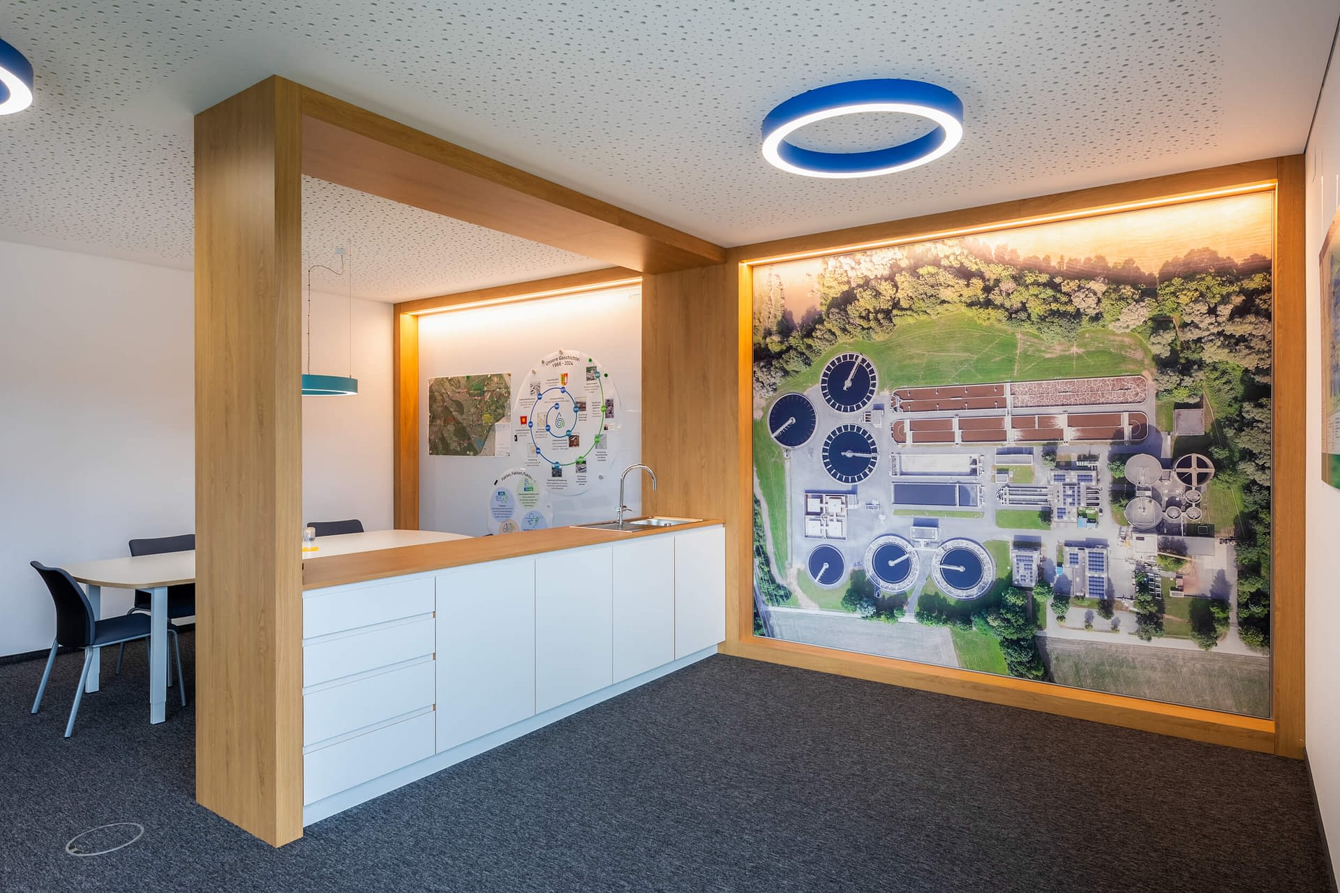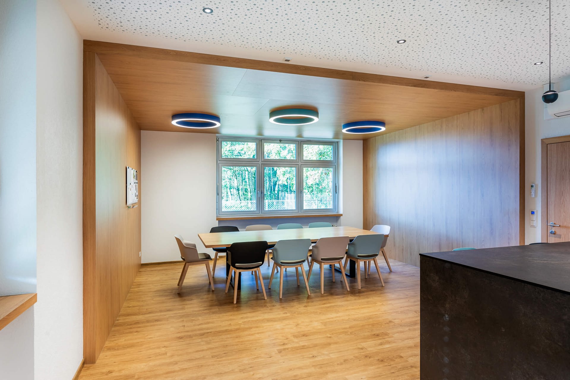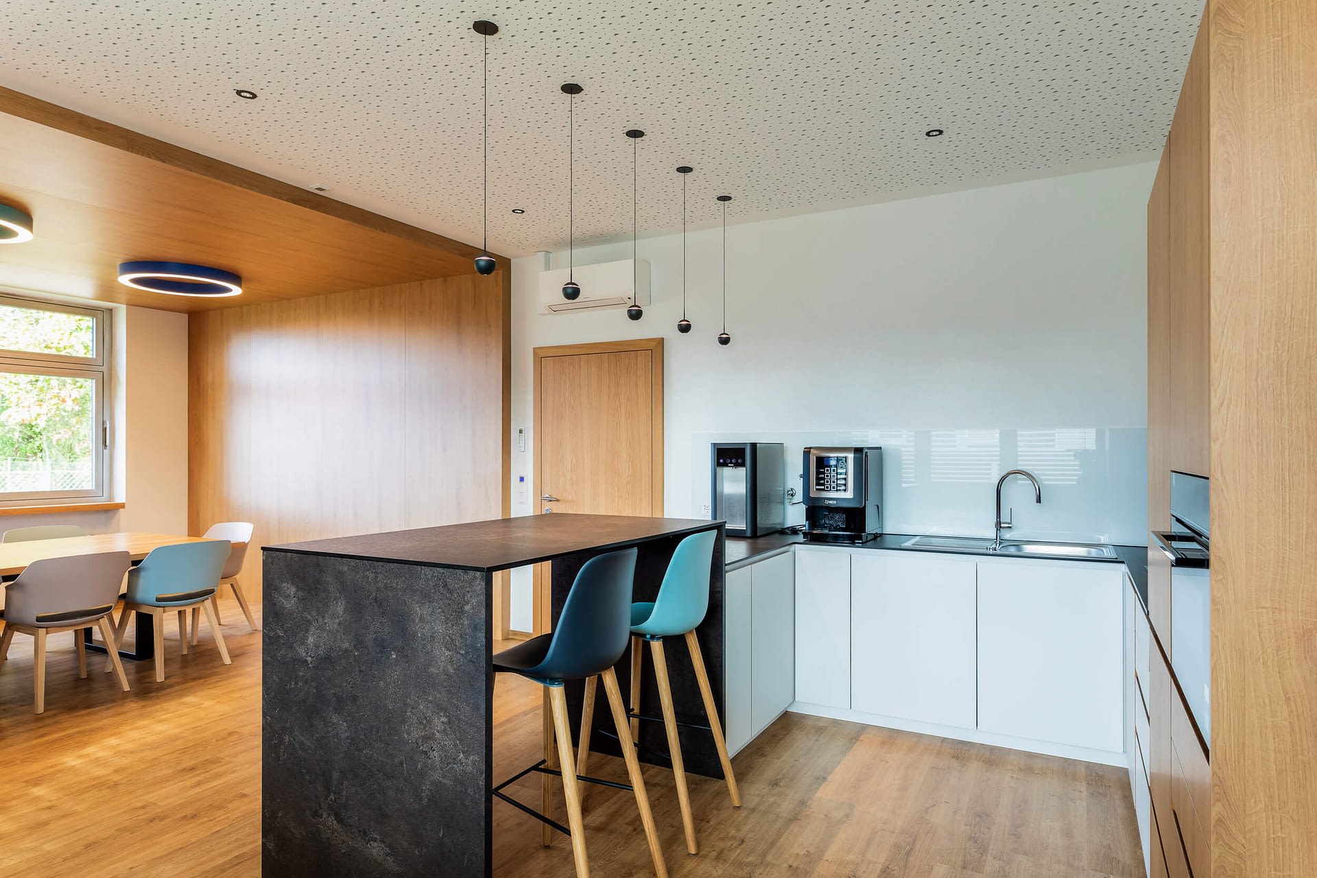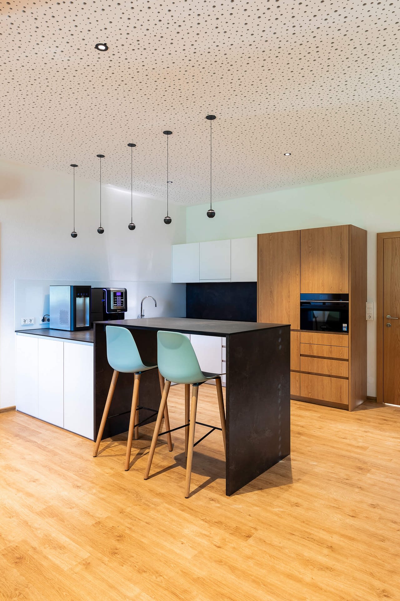 Die Mitarbeiterküche und der Essbereich wurden zu einem echten Wohlfühlbereich. Die U-förmige Küche, ausgestattet mit modernsten Geräten, bietet nicht nur genügend Stauraum, sondern auch ein integriertes Stehbar, das die Mitarbeiter zu gemeinsamen Kaffeepausen einlädt. Die Hochschränke aus Eichen-Schichtstoff mit weiterlaufendem Frontbild, fügen sich elegant in das Gesamtbild ein, während die hochwertige Kompaktplatte der Arbeitsplatte sowohl durch ihr Design als auch ihre Funktionalität überzeugt.