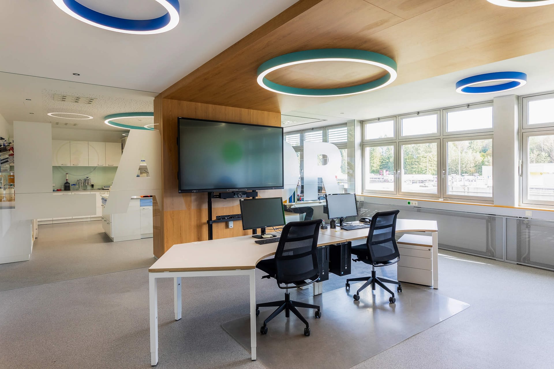 Ein wahres Meisterstück ist das maßgefertigte Möbelstück im Laborraum. Der über 7 Meter lange Schrankverbau vereint Stauraum und Multimedia-Elemente und teilt den Raum auf elegante Weise. Auf der einen Seite finden sich Glasschiebetüren, auf der anderen Multimedia-Integration mit einem großen TV. Die Deckenverkleidung, die mit integrierter Beleuchtung ausgestattet ist, setzt einen luxuriösen Akzent und ergänzt das Möbelstück perfekt.