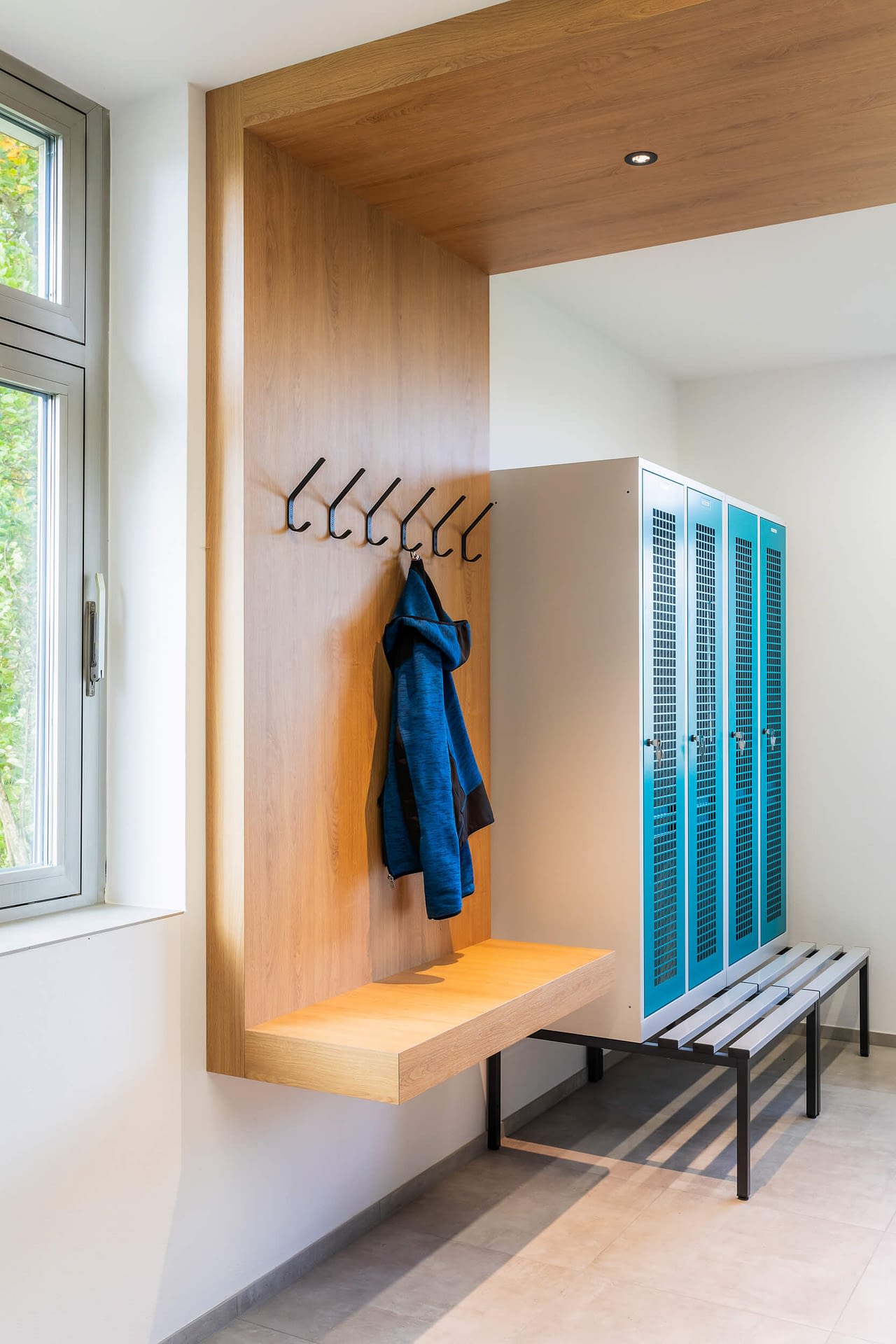 Besonders im Sekretariat wurde der umlaufende Rahmen nicht nur als ästhetisches Highlight gestaltet, sondern auch funktional integriert: Die Beleuchtung, Schränke und Ablagen sind harmonisch in den Rahmen eingebaut, wodurch eine einzigartige Symbiose aus Stil und Funktionalität entsteht. In der Garderobe haben wir ebenfalls auf Gehrung verleimte Eichenholzrahmen verwendet, die nicht nur die Beleuchtung perfekt in Szene setzen, sondern auch Kleiderhaken und eine Sitzgelegenheit/Ablage geschickt vereinen.