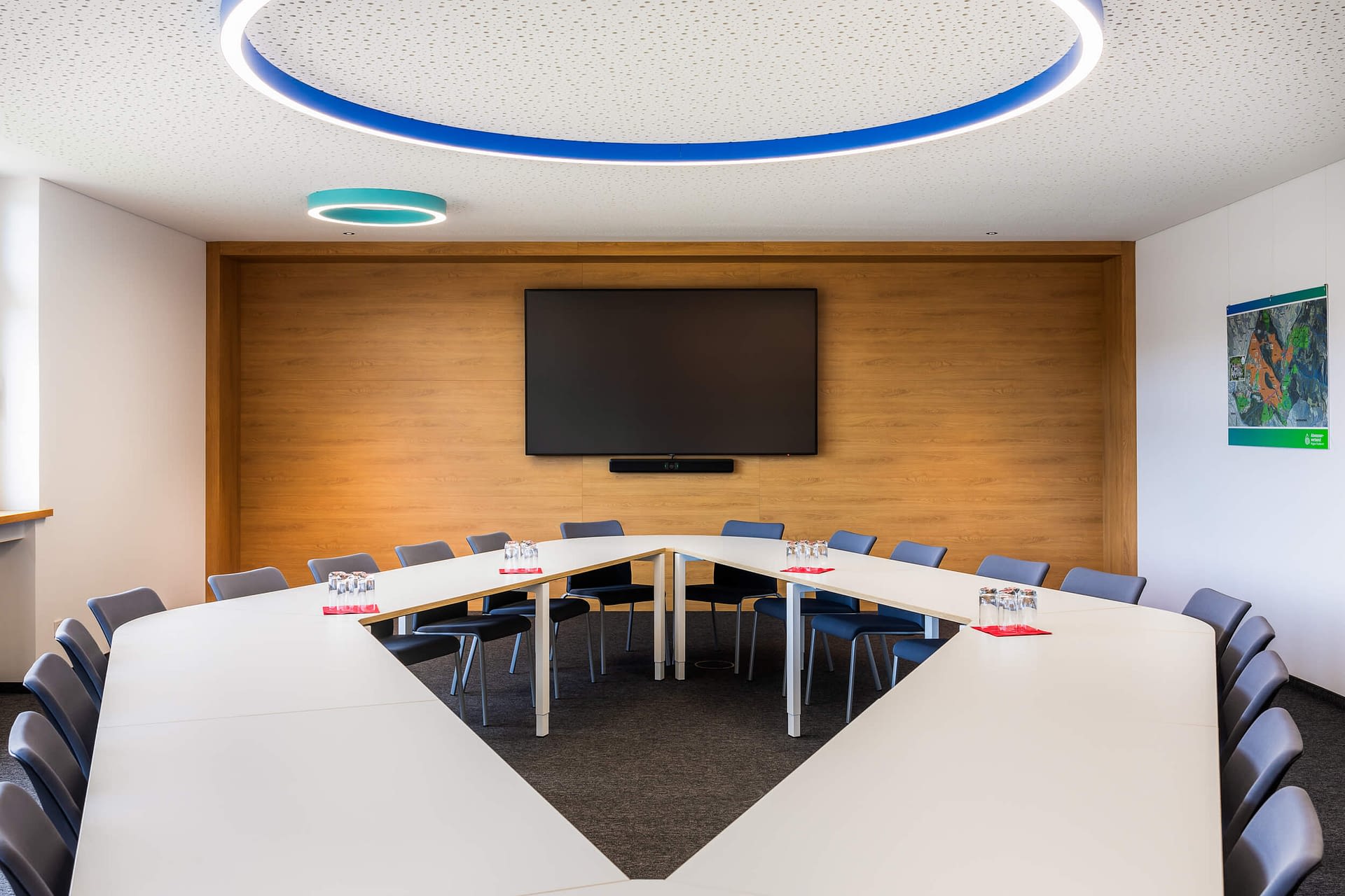 Im großen Besprechungsraum haben wir eine über 6 Meter lange Wandverkleidung eingebaut, die das Design der restlichen Möbel nahtlos fortführt. Ein weiteres Highlight bilden drei, um 90° aufgefächerte Rahmen aus Eichenholz, die als Bilderrahmen mit integrierter Beleuchtung dienen. Der dritte Rahmen im Raum enthält eine Teeküche, die von beiden Seiten zugänglich ist – eine elegante Lösung für den modernen Büroalltag.